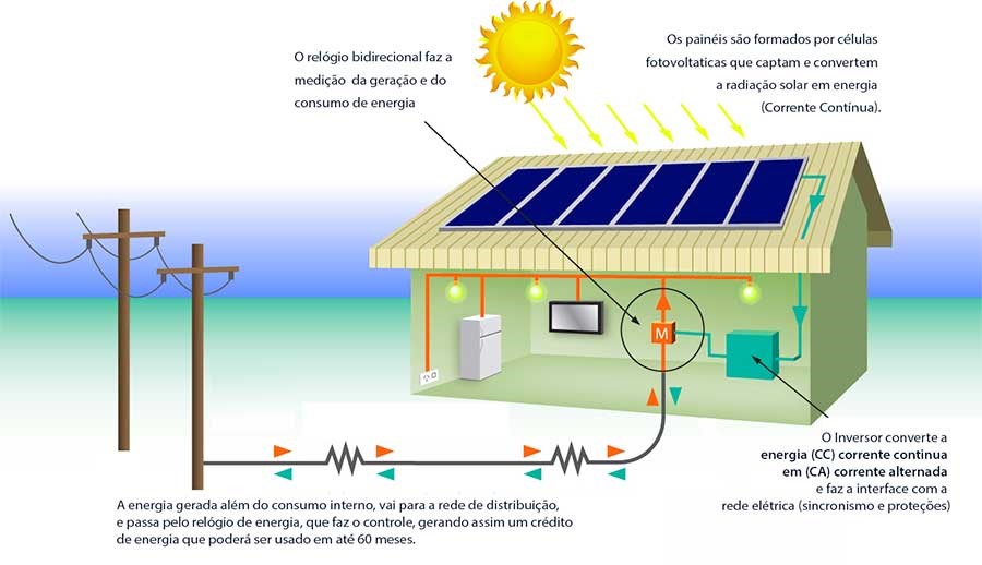 O sistema de compensação de energia é um sistema que permite ao consumidor compensar a energia gerada pelo seu gerador junto a distribuidora de energia elétrica. Quando o gerador fotovoltaico gerar mais do que o usuário consome, a energia excedente será injetada na rede elétrica; quando for ao contrário, o usuário irá consumir a energia da distribuidora. O medidor bidirecional irá então medir as energias consumida e injetada; o consumidor deverá pagar apenas pela diferença de energia apurada no período de medição, mais os impostos e encargos incidentes. Se houver crédito de energia a favor do consumidor, ele deverá pagar apenas o valor da disponibilidade daquele mês; o crédito será abatido nos períodos seguintes. Caso contrário, o consumidor deverá pagar pela diferença de energia a favor da distribuidora.